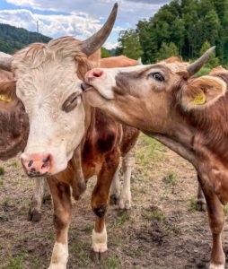 Wenn man Kühe beobachtet, sieht man zum Teil, wie sie miteinander kommunizieren oder ihren verschiedenen Charakter. Wenn eine Kuh Falten im Hals hat, bedeutet das, dass sie angespannt ist und wahrscheinlich nicht genau weiss, ob ihr Gegenüber freundlich ist.
