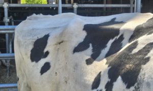 Die Milchproduktion ist durchgetaktet, es ist ein Kreislauf: künstlich besamt werden, 9 Monate trächtig* sein, gebären, vom neugeborenen Kind getrennt werden, dann gemolken werden und nach ca. 2 Monaten wieder besamt werden, damit die Milchproduktion nicht aufhört. Bis nach etwa 5–6 Jahren und 4 Kälbern später ist die Mutterkuh nicht mehr produktiv genug oder sie kann nicht mehr trächtig werden. Dann wird sie geschlachtet und das Fleisch wird für Tierfutter benutzt, weil es zu zäh für den Menschen wäre. Auf dem Bild sieht man eine Kuh die schon älter ist und sie hat nur noch Knochen Gestell weil sie sehr viel Energie braucht für die Milch.