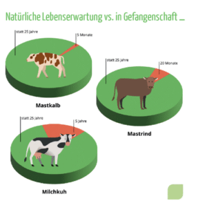 Bei der Fleischproduktion geht es nur darum, so schnell wie möglich Muskelmasse aufzubauen. Für das werden Mastrinder und Mastkälber gezüchtet, die klein und dick sind, anstatt gross und schlank wie die Milchkühe. Um das Fleisch hell zu halten, erhalten sie oftmals nur die Mindestmenge an Heu, und durch das leiden sie unter Eisenmangel.