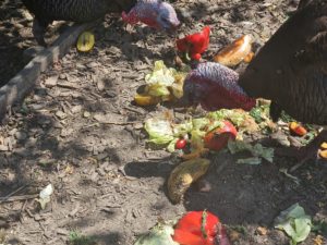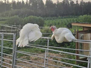 Die Truthähne hat man gekauft, als sie sechs Wochen alt waren. Sie hatten vorher nur noch einen und suchten Freunde für diesen. Auf dem Foto sind sie drei Monate alt, die weißen sind weiblich. Eigentlich wären sie schon mit 16 Wochen geschlachtet worden. Es gibt noch weitere Truthähne, weil es zu viele waren und sie von Privatpersonen abgegeben wurden.