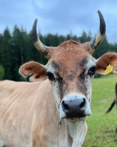 Sieben Kühe leben auf einer Weide in einem Nachbardorf. Sie sind da, weil sie keine Kälber mehr bekommen, wenig Milch geben, gerettet wurden oder gesundheitliche Probleme haben.
