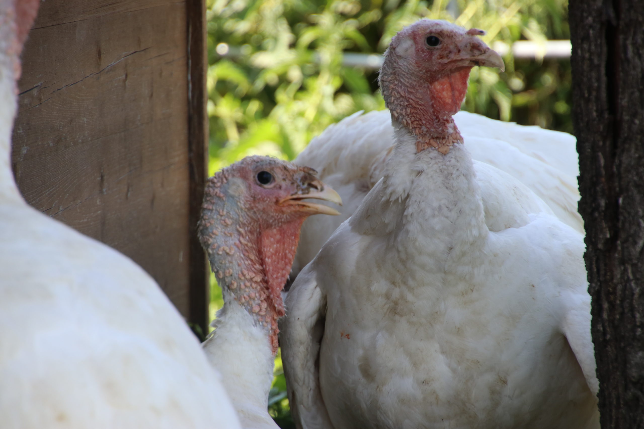 Die Truthähne hat man gekauft, als sie sechs Wochen alt waren. Sie hatten vorher nur noch einen und suchten Freunde für diesen. Auf dem Foto sind sie drei Monate alt, die weißen sind weiblich. Eigentlich wären sie schon mit 16 Wochen geschlachtet worden. Es gibt noch weitere Truthähne, weil es zu viele waren und sie von Privatpersonen abgegeben wurden.