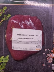 Im Lebensmittelgeschäft findet man Pferdefleisch aus Frankreich oder Spanien. Viele Händler haben aufgehört, Pferdefleisch aus Argentinien oder Kanada zu nehmen, weil die Pferde unter erniedrigenden Bedingungen gehalten und behandelt werden. Aber auch in der EU ist es nicht besser. Oft werden Pferde von Polen nach Frankreich transportiert. Während der Fahrt haben sie fast kein Wasser oder Heu und der Transporter ist viel zu klein für so viele Pferde. Die Pferde sind verletzt oder schon halb tot, wenn sie ankommen. Das Veterinäramt interessiert sich zu wenig für die Verletzungen während des Transports bei der Grenzüberschreitung. Im Jahr 2024 wurden in der Schweiz 1’190 Pferde für den Fleischkonsum geschlachtet, aber rund 91,8 % von dem Pferdefleisch, das die Menschen konsumieren, stammen aus dem Ausland. Viele Menschen können sich aber nicht vorstellen, ein Pferd zu essen, weil man oft einen persönlichen Bezug hat, z. B. Bei Fohlen sagen viele, dass es viel zu jung ist, um es zu essen, aber ein Kalb, das genauso alt ist, isst man ohne Bedenken.