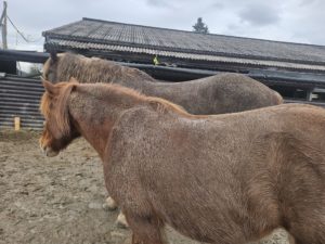 Wenn man ein Sportpferd im Winter anschaut, hat es eine Decke an. Viele denken, dass es friert, aber eigentlich haben sie zwischen dem Fell und der Haut eine isolierende Luftschicht, die für die natürliche Thermoregulation sorgt. Dasselbe haben auch wir, wenn wir Gänsehaut haben. Wen aber ein Pferd zu oft eine Decke trägt, baut sich diese Thermoregulation* ab wie bei uns die Muskulatur. Bei dem Pony sieht man das genügend Fell hätte für den Winter. Die Decke drückt das Fell herunter.