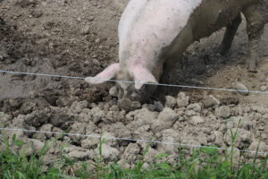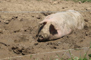 Gerne suhlen sich Schweine auch im Schlamm, wodurch sie sich kühlen und säubern. Wenn sie die getrocknete Schlammkruste abreiben, entfernen sie damit Milben, Flöhe und anderes Ungeziefer.