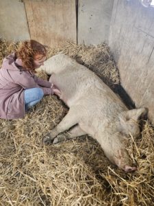 Ich habe 13 Kinder bekommen. Ich freute mich sehr, sie aufwachsen zu sehen. Ich möchte so gerne meinen Kindern zeigen, wie das Leben von einem Schwein ist. Aber ich selbst habe es nie erlebt. Niemand hatte es mir gezeigt. Vielleicht erleben viele Schweine, die durch die Menschentür gingen und nie mehr zurückkommen*, was ein Schwein in der Natur tut. Diese Frage beschäftigt mich sehr oft. Einen Monat lang trinken sie meine Milch, dann werden sie mir genommen. Ihr warmes Gewicht an meinem Körper, ihr leises Quieken, plötzlich sind sie fort. Diese zarte Beziehung, die ich jedes Mal zu meinen Kindern aufbaue, wird einfach zerbrochen und ich höre, wie meine Kinder Angst vor den Menschen haben. Jedes Mal versuche ich, meine Kinder zu beschützen, aber die Menschen waren stärker. Jedes Mal, wenn ein Mensch zu mir kommt und meine Kinder noch bei mir sind, habe ich Angst, dass sie mir wieder weggenommen werden. Was passiert mit meinen Kindern? Wie gerne würde ich sie so lange behüten, bis sie sich selbständig ablösen und mich nicht mehr brauchen. Jetzt habe ich eine Woche Pause, bis ich wieder trächtig bin und der ganze Prozess wieder beginnt.